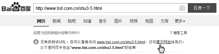 图4-15在百度搜索结果里显示:找不到该URL。点击【提交网址】,进入下一个界面,按提交就OK了。需要指明的一点是,我提交的网址是我的第一本书《传统行业如何用网络拿订单》第三章第5节的内容,我在四年前就将此书的全部内容放在我的博客网站(www.zhangjin111.com)。在2015年改版公司官网时,将博客里的内容原封不动地复制到新网站上(www.tist.com.cn),结果就是百度认定博客里的文章为原创,而官网里的文章为抄袭,不予收录。可见百度也有相应的算法,防止同一个内容在网上大量地复制而成了垃圾信息,它只收录最早的信息作为原创内容。